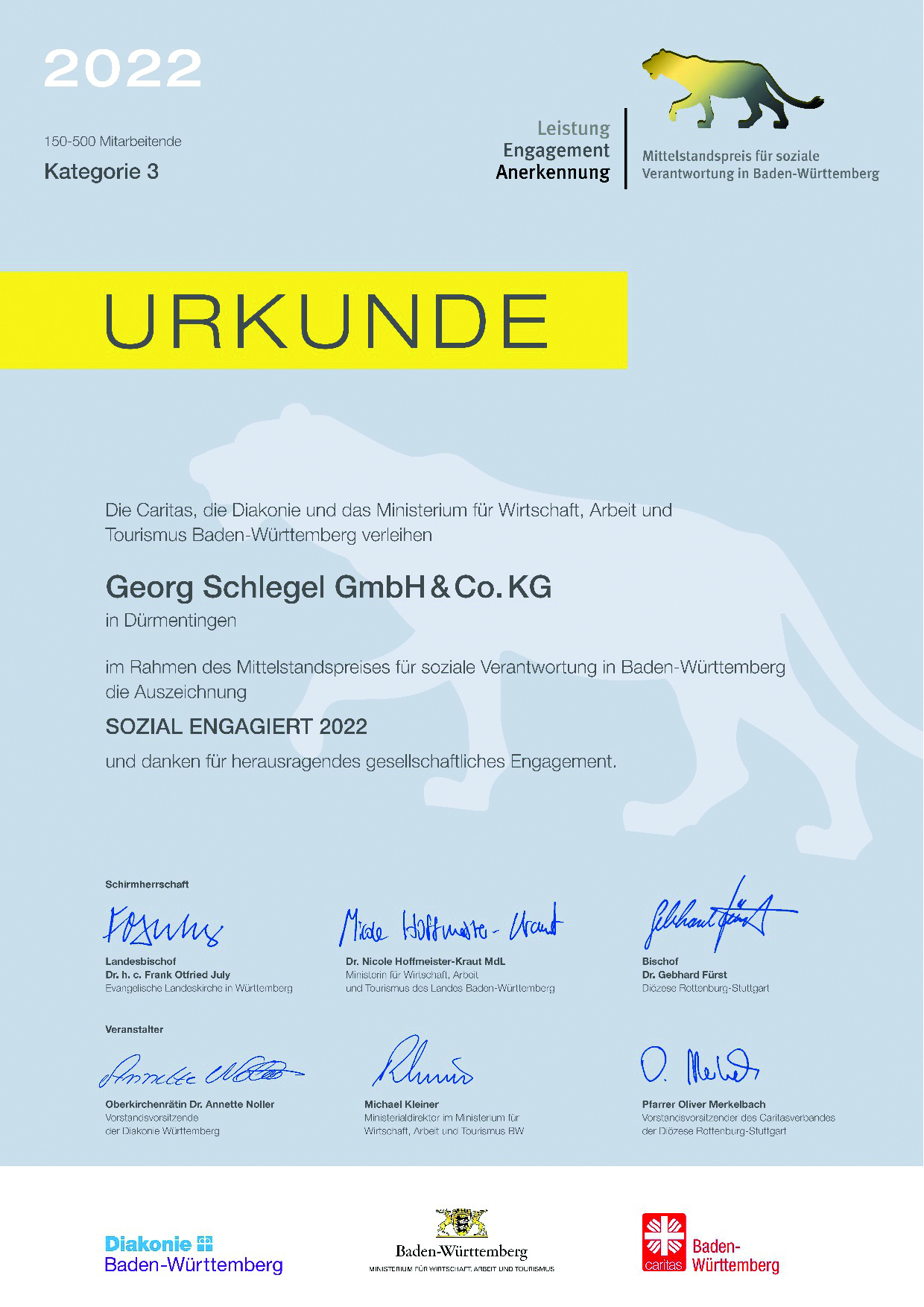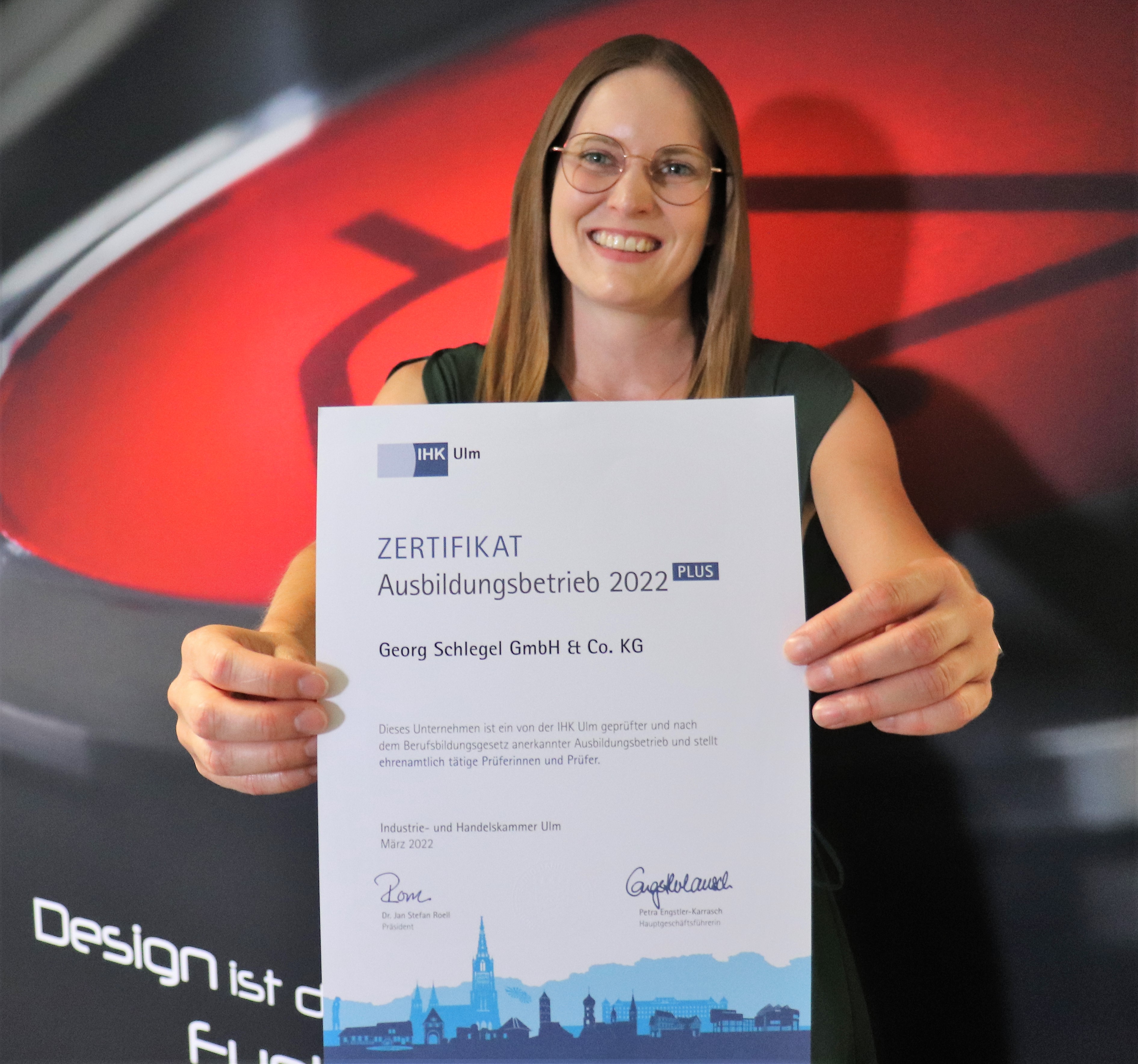 Dem Unternehmen GEORG SCHLEGEL aus Dürmentingen ist von der IHK Ulm auch für das Jahr 2022 das Zertifikat „Ausbildungsbetrieb plus" zuerkannt worden.