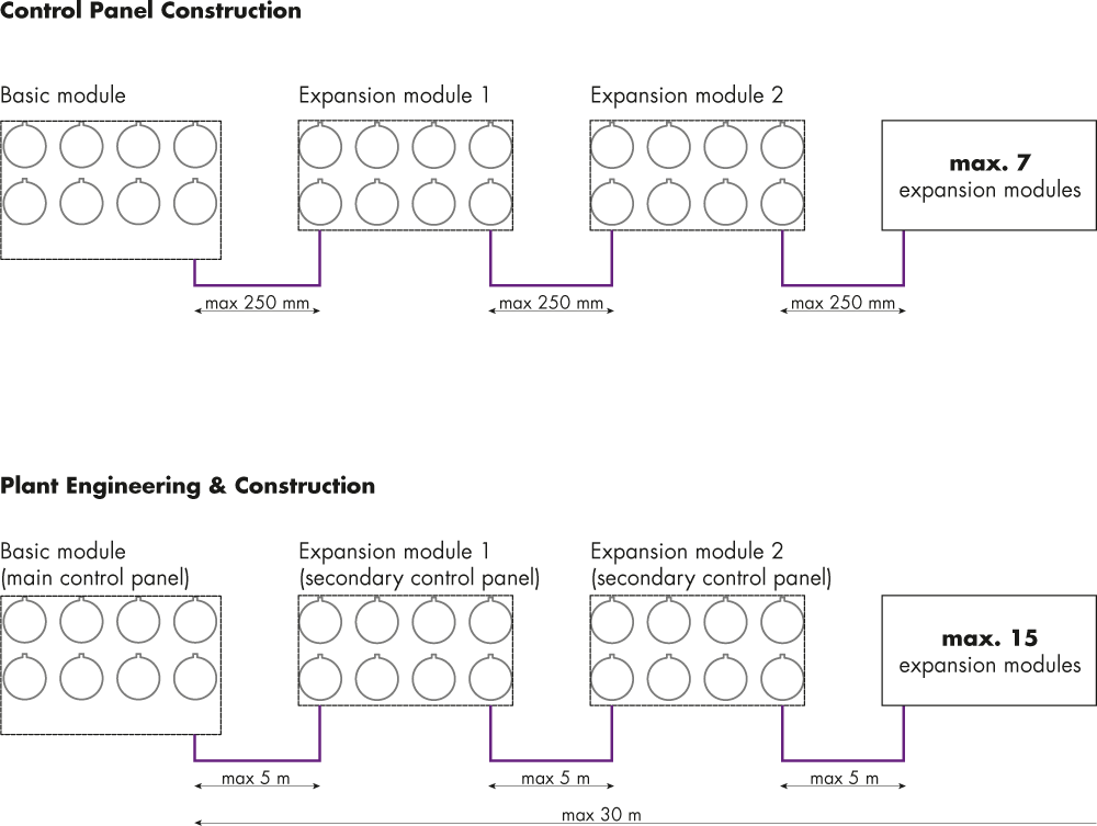 In the plant engineering & construction we consider the complete plant, which usually has a main control panel and several secondary control panels. In this case, the main control panel is equipped with the basic module and according to your operating concept, with additional expansion modules. The bus node with the typical bus connection is also arranged in the main control panel. It is then possible to equip more secondary control panels with expansion modules and to operate them via the main control panels using the bus data. In this application you can operate max. 128 command positions with 128 pilot lamps, and this at a cable length of 5m between the command positions and a total length of 30m within the plant.