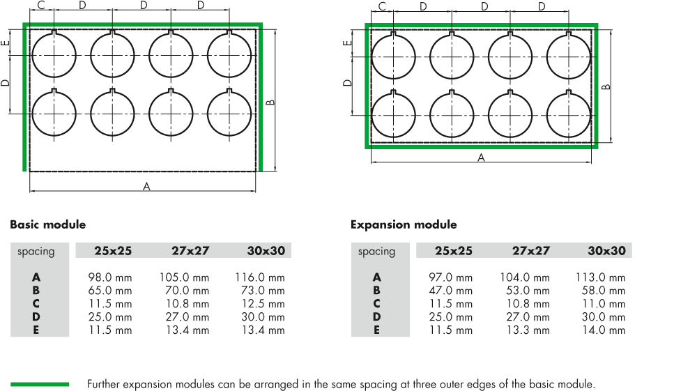 We offer the standardised modules in fixed grid spacings of 25 x 25mm, 27 x 27mm or 30 x 30mm. The modules are plugged on the actuators in the front panel and secured with the actuators by means of a locking bolt at the contact block. Therefore, no additional spacers are needed in the front panel to mount the modules. The basic module is supplied with a supply voltage of +24V/DC and the bus signal. The expansion modules are connected to each other by means of a connecting cable, thus, there is no need for an additional wiring by what the wiring outlay reduces enormously. The individual modules can be attached in the same spacing.