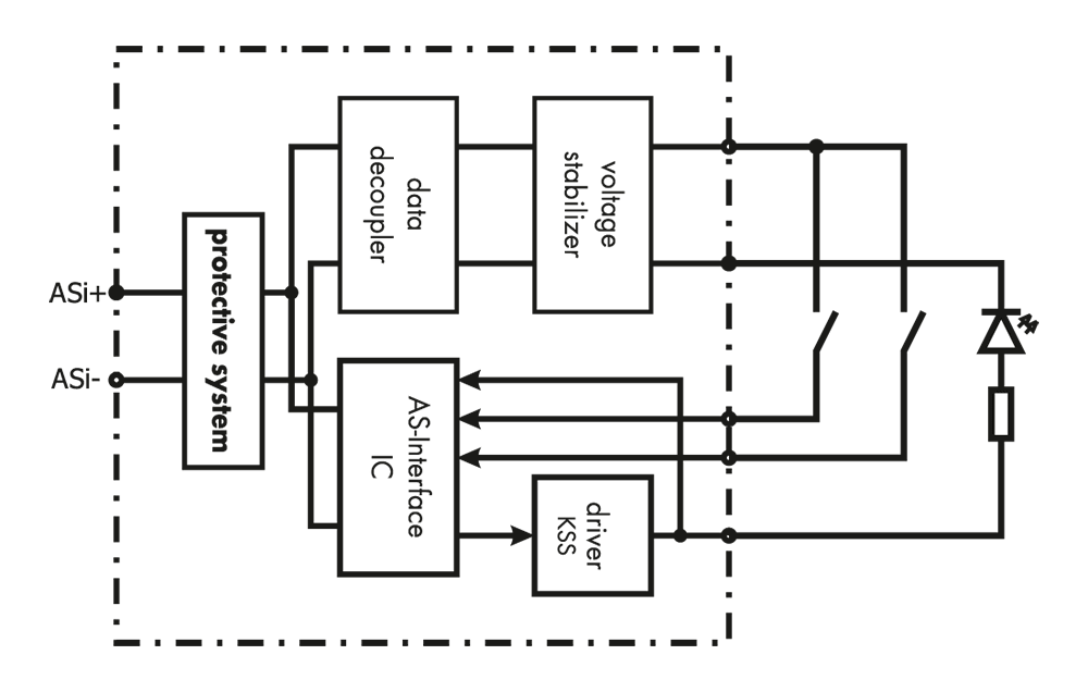 スレーブにつき10本までのケーブルの代わりに、ASiは、絶縁体を挿して接続(IDCテクノロジー)する2本の電線のみ必要です、そして全てのアドレスを割当てられたスレーブを通じてループされます。62個のコントロールユニットまで一体の2線式電線に接続できます。このスレーブの働きは、絶縁体を剥く時間、潜在的にあるエラー数の削減、必要な場合は、簡単に変更でき拡張できます。ASインターフェイスネットワークの構築のために、シュレーゲル社製スレーブはどこの位置でも接続できます。それぞれのコントロール及び信号ユニットはASインターフェイスシステム内で個々のアドレスを持った分割したノードとなります。
