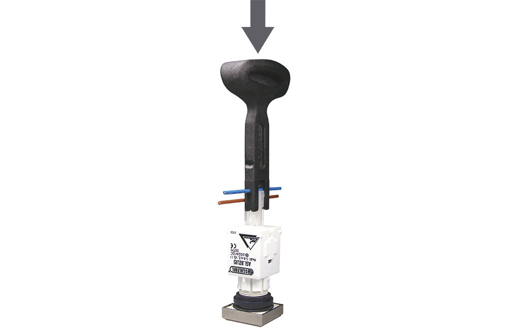 工具“ASI_ MRT”は単線をIDCコネタクに圧入するために供給されます。推奨:カバー“ASI_K2”を使用する事により、IDCコネクタにオプションのストレンリリーフ付となります。relief is achieved at the IDC connector!